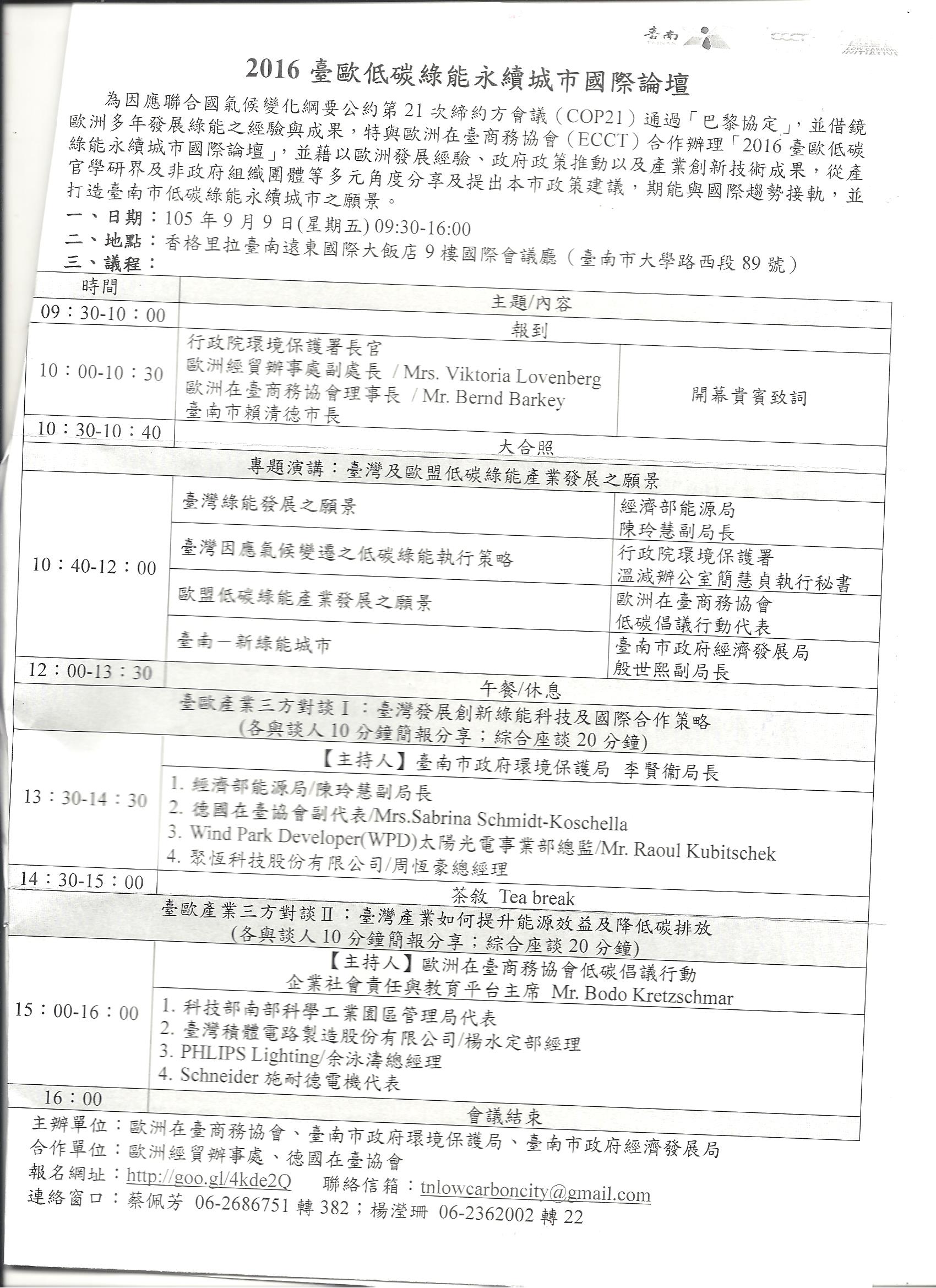 因應聯合國氣候變化綱要公約第21次締約方會議(COP21)通過巴黎協定,並借鏡歐洲多年發展綠能之經驗與成果,特與歐洲在臺商務協會(ECCT)合作舉辦「2016臺歐低碳綠能永續城市國際論壇」,並藉以歐洲發展經驗、政府政策推動及產業創新技術成果,從產官學研界及非政府組織團等多元角度分享及提出本市政策建議,期能與國際趨勢接軌,並打造臺南市低碳綠能永續城市之願景。
